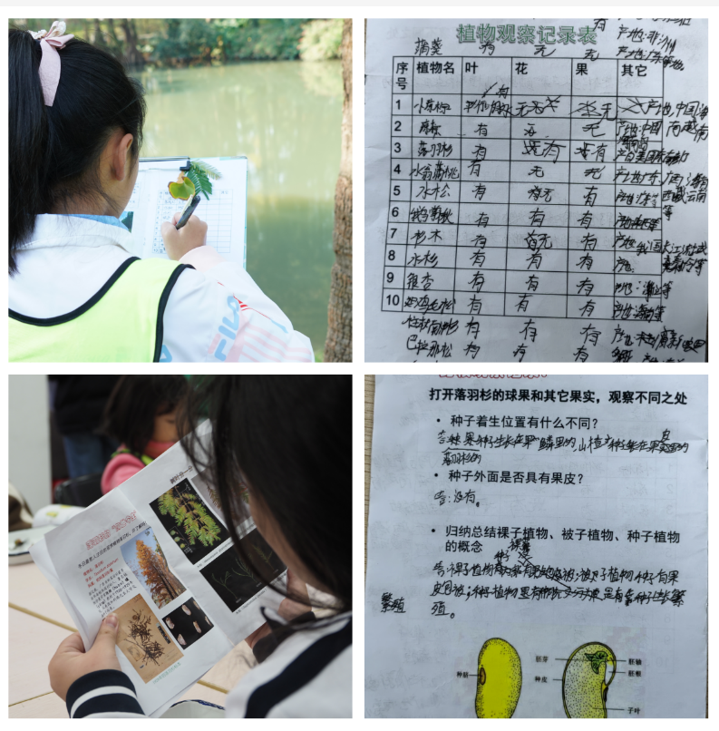 落羽杉林被稱作“水上森林”,它在水中不會倒,有什么秘訣呢?人們常常將落羽杉錯認作水杉,水杉和落羽杉有什么區別?為什么水松會被列為國家一級重點保護植物?同學們帶著一系列的疑問在孑遺植物區仔細觀察,認真探究,在自然中尋找答案。