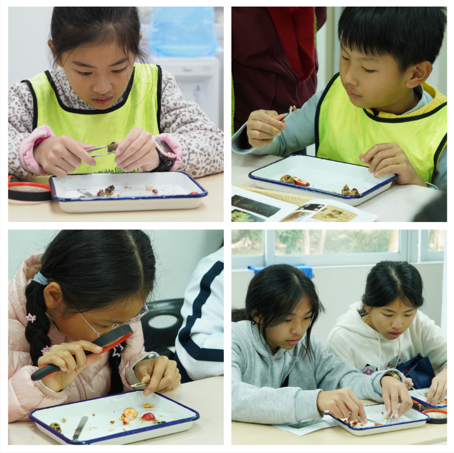 落羽杉是裸子植物,沒有真正意義上的花。從果實的外表上我們很難分辨裸子植物和被子植物,雙子葉植物和單子葉植物等,那么就通過解剖來一探究竟吧!活動以落羽杉球果、山楂、花生等作為實驗對象,同學們拿起鑷子、解剖刀、培養皿等工具,學習如何正確解剖果實,通過對比直觀感受不同植物的不同特征,種子的著生位置有什么不同?種子外面是否具有果皮?同時啟發他們對植物傳粉方式、種子傳播方式的思考。 “哇”課堂上同學們時不時發出驚嘆聲,他們對植物有了更多的發現,紛紛踴躍發言。