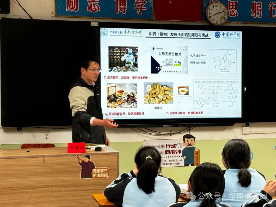 華南植物園農業與生物技術研究中心譚海波副研究員向高二年級開展主題為“天然產物與人類健康”的講座。內容涵蓋天然產物在人類健康中的重要性,包括青蒿素等天然產物的價值,以及非傳染性疾病和傳染性疾病對人類健康的威脅。分析了中國醫藥工業和中草藥的發展現狀、挑戰和未來前景。詳細探討了天然產物在生活中的應用以及嶺南特色藥用植物的活性成分研究和抗MRSA先導藥物的發現。