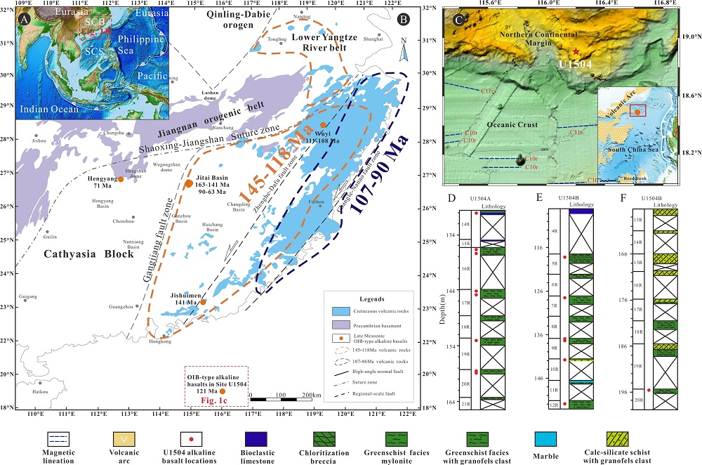 陸弧是板塊俯沖體系中大量巖漿產生的場所,也是地球陸殼生長的主要工廠。這些過程通常被認為與起源于俯沖流體或熔體的島弧拉斑-鈣堿性系列巖漿作用有關。近年來隨著研究的深入,陸弧區也陸續發現了起源于富集地幔的堿性玄武巖。然而,由于堿性玄武巖在陸弧區分布稀少,尚未對其進行系統的研究。作為俯沖帶特有的熔融產物,堿性玄武巖攜帶著不同于島弧拉斑-鈣堿性系列巖漿的信息,在揭示陸弧深部地幔多樣性和俯沖動力學方面具有獨特的潛力。基于此,研究團隊以華南陸弧為研究靶區,對陸弧中的堿性玄武巖(IODP U1504站位)開展了主微量元素、Sr-Nd-Hf同位素和40Ar/39Ar定年研究。