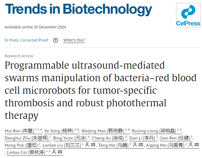 北京時間12月21日,中國科學院深圳先進技術研究院醫藥所蔡林濤團隊和醫工所馬騰團隊聯合在國際學術期刊《Trends in Biotechnology》上發表了題為“Programmable Ultrasound-Mediated Swarms Manipulation of Bacteria-Red Blood Cell Microrobots for Tumor-Specific Thrombosis and Robust Photothermal Therapy”的文章。該工作成功開發了一種具有自主缺氧感知和超聲響應功能的細菌-細胞生物機器人,通過缺氧靶向聯合超聲操控,實現腫瘤深層滲透和生成腫瘤特異性血栓,最終實現高效精準治療。