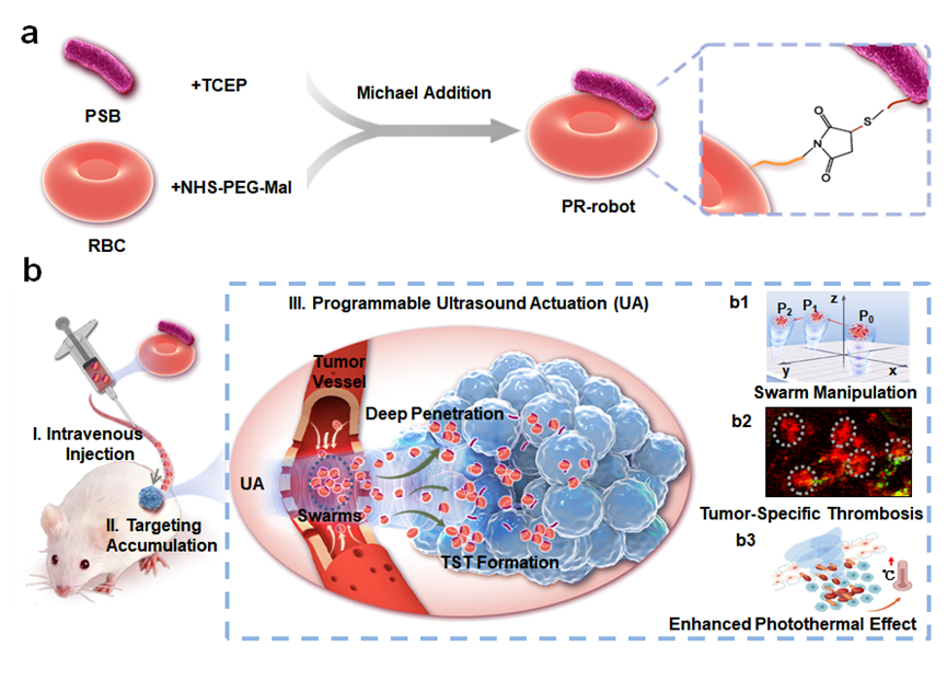 該研究利用光合細菌獨特的缺氧感知能力和自身分泌細菌葉綠素的特性,結合紅細胞雙凹圓盤結構的特點,構建了一種光合細菌-紅細胞偶聯的生物微型機器人(PR-robot)。該生物機器人具有較長的體內循環時間,并自主靶向腫瘤區域,提高了腫瘤特異性富集效率。同時,紅細胞的特殊結構增強了PR-robot的聲阻抗,使PR-robot能夠以生物集群方式被超聲鑷精確控制和驅動,甚至穿越生物屏障、深度滲透到腫瘤組織內部。生物群的涌入誘導腫瘤特異性血栓的形成,協同光合細菌增強光熱抗腫瘤效果。