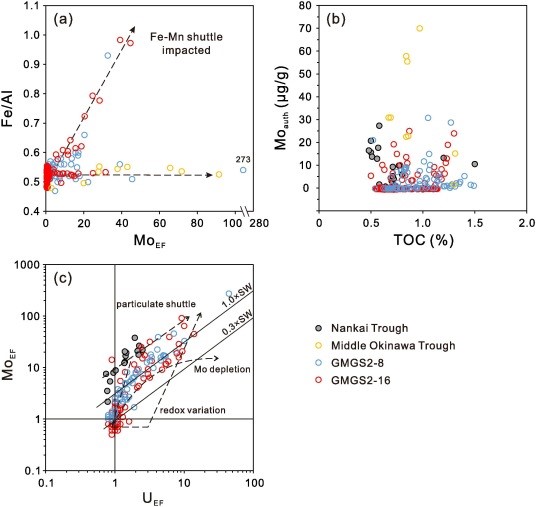 其中較高的自生鉬同位素(δ98Moauth>1.5‰)反映了較低甲烷滲漏情況下,海水中的鉬通過擴散作用進入沉積物孔隙水中,并在硫化環境中轉變成硫代鉬酸鹽,導致鉬同位素分餾。而自生鉬同位素值的降低與沉積物Fe/Al和Mn/Al的升高則表明,在甲烷滲漏強烈的情況下(存在甲烷氣泡),鐵錳氧化物和氫氧化物顆粒的穿梭過程更為活躍。
