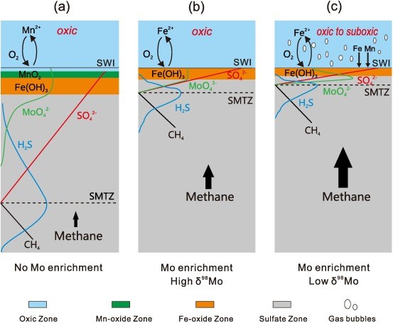研究認為,在甲烷滲漏通量較低時,沉積物中的鉬主要來源于海水中鉬的向下擴散。而在甲烷滲漏強度較高時,向上的甲烷氣泡和羽狀流促進了大量鐵和錳從沉積物深部釋放到上層水體,這些釋放出的鐵和錳遇到氧化的底層水后形成氧化物和氫氧化物顆粒。這些顆粒從海水中吸附鉬,隨后又回到沉積物中,在缺氧條件下分解釋放出鉬。釋放出的鉬被沉積物孔隙水中的硫化氫固定,最終導致冷泉沉積物中鉬的富集。