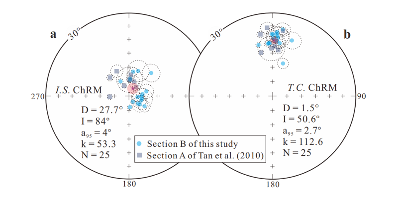 圖1?本研究報道的帕那組火山巖特征剩磁方向