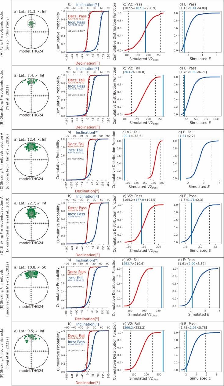 圖2?林周盆地晚白堊世–始新世古地磁數(shù)據(jù)與地磁場長期變模型的一致性檢驗支持較高的古緯度結(jié)果