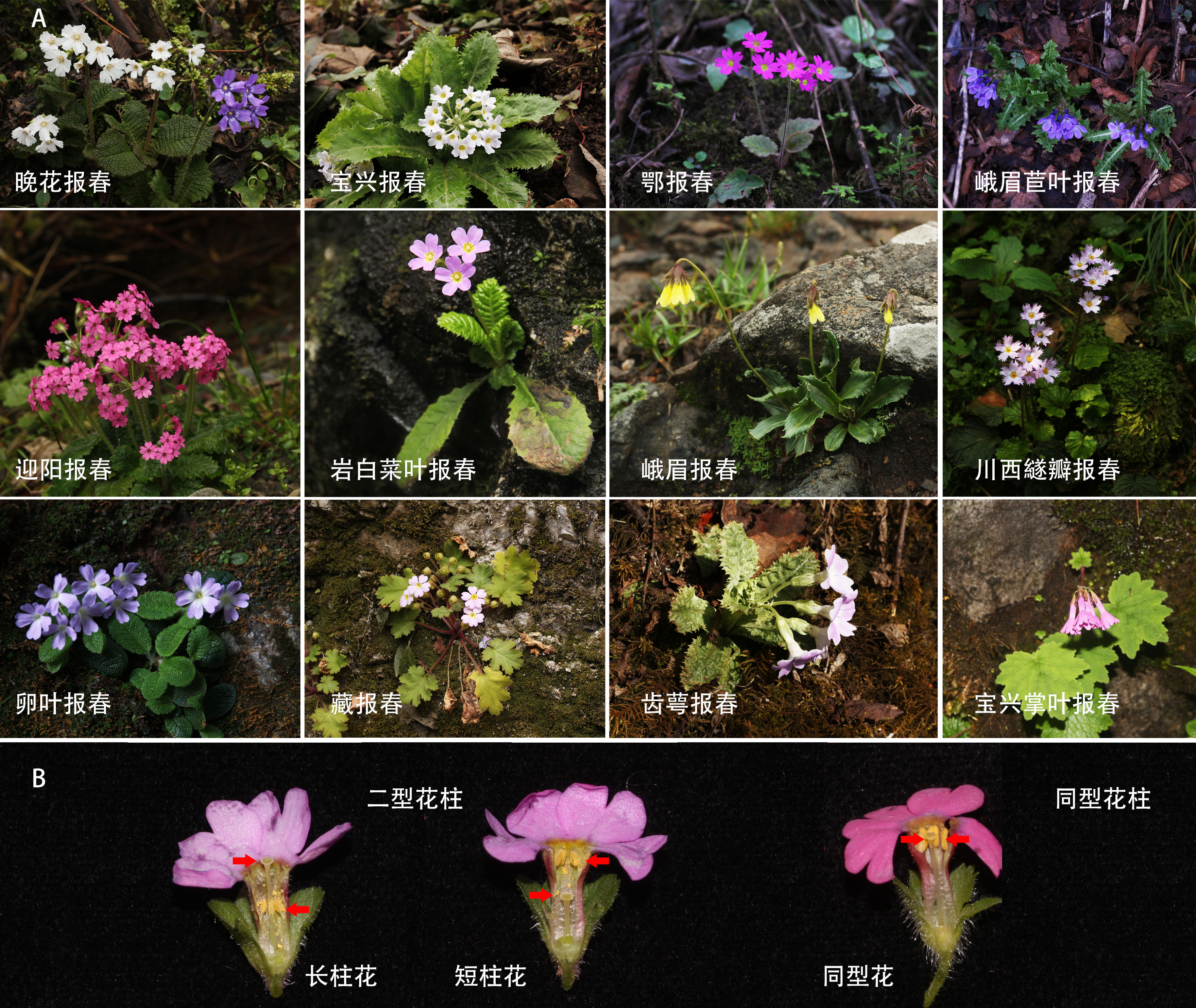 圖1. 報春花屬物種及其二型花柱特性。A 西南地區代表山地峨眉山廣泛分布的12種報春花屬物種;B 迎陽報春的花結構特征,分別展示長柱花,短柱花以及同型花。紅色箭頭分別指示柱頭和花藥
