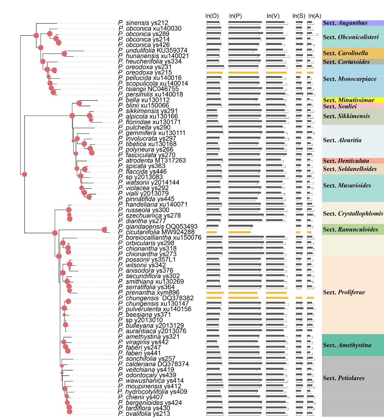 圖2. 基于三個葉綠體片段的報春花屬物種系統發育樹。右側展示的條形圖分別代表配子數目及花性狀數據。