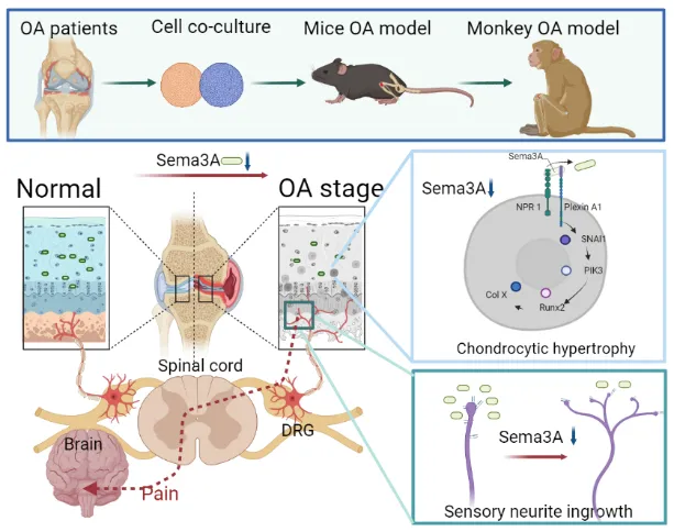 2025年1月2日,中國科學院深圳先進技術研究院腦認知與腦疾病研究所楊帆研究員團隊、生物醫藥與技術研究所陳棣教授團隊聯合四川大學華西醫院周宗科主任團隊在這一領域取得重要突破,相關研究“Neuronal guidance factor Sema3A inhibits neurite ingrowth and prevents chondrocyte hypertrophy in the degeneration of knee cartilage in mice,monkeys and humans”發表在Bone Research雜志。
