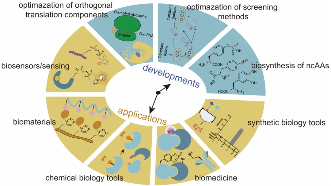 長期以來,DNA和RNA一直被視為存儲和傳遞遺傳信息的分子,而蛋白質(zhì)則是生命活動的主力軍。然而,天然蛋白質(zhì)僅由20種天然氨基酸構(gòu)成,這一定程度上限制了蛋白質(zhì)的結(jié)構(gòu)與功能多樣性。如今,基因密碼子擴展(GCE)技術(shù)正在打破這一局限,為生命科學(xué)研究帶來全新可能。該技術(shù)通過引入正交的氨酰-tRNA合成酶(aaRS)/tRNA對,在活細胞甚至完整生物體內(nèi)的蛋白質(zhì)翻譯過程中,精準(zhǔn)地將非天然氨基酸(ncAA)定點引入蛋白質(zhì)。迄今,已有超過200種功能獨特的ncAA成功通過用于GCE技術(shù),其多樣的化學(xué)基團推動了分子生物學(xué)、合成生物學(xué)以及生物醫(yī)學(xué)領(lǐng)域的快速發(fā)展。GCE技術(shù)不僅拓展了蛋白質(zhì)的化學(xué)潛力,也為研究人員探索、操控和開發(fā)蛋白質(zhì)功能,以及創(chuàng)新治療手段提供了全新的工具。