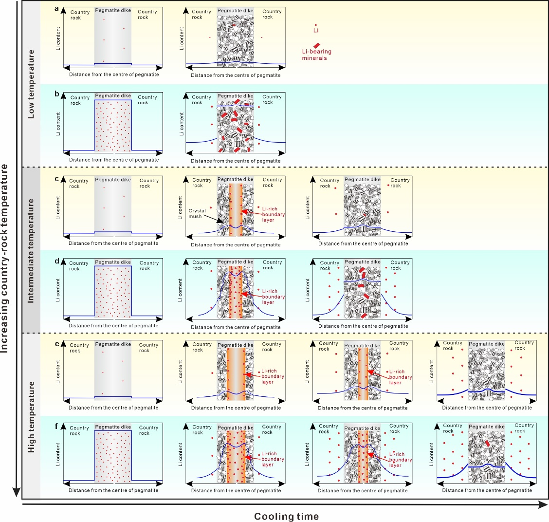 近日,中國科學院廣州地球化學研究所王強研究員團隊聯合王核研究員等,針對這一重要問題,在對川西甲基卡偉晶巖型鋰礦床天然樣品分析的基礎上,結合熱模擬和擴散模擬(圖1),發現偉晶巖脈的鋰含量不僅僅取決于初始熔體的鋰含量,還受控于侵位時的圍巖溫度(圖2)。在高溫的圍巖中,偉晶巖脈具有長的熱壽命,初始偉晶巖熔體即使具有高的鋰含量,都會通過顆粒邊界擴散作用遷移進入圍巖中,從而很難以形成富鋰偉晶巖;而在低溫的圍巖中,偉晶巖脈具有短的熱壽命,擴散作用的程度有限,使得偉晶巖能夠鎖住大部分的鋰而形成富鋰礦物,從而有利于形成富鋰偉晶巖。圍巖溫度則主要取決于母巖體(巖漿儲庫)產生的熱場,即近端的圍巖具有高的溫度,而遠端的圍巖則具有低的溫度。這一新認識與偉晶巖礦床中的經典分帶模式相一致,即絕大部分的富鋰偉晶巖都分布在遠離巖體的低溫圍巖區域。