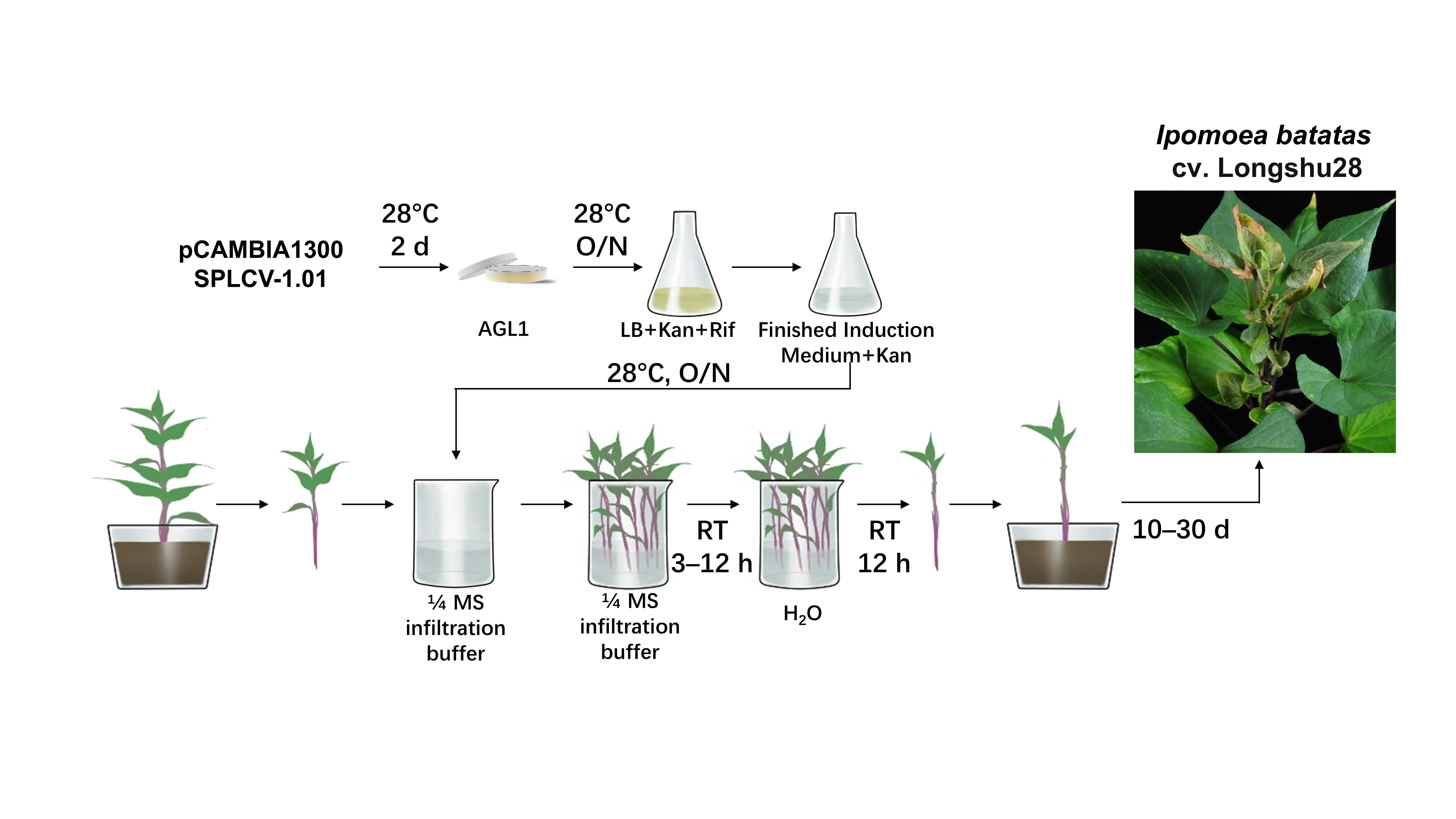 雙生病毒科是病毒界中最大的一個科。雙生病毒通常含有一個或兩個單鏈環(huán)狀DNA,分別稱為單組分雙生病毒和雙組分雙生病毒,單組分雙生病毒通常還伴隨一個衛(wèi)星DNA。甘薯曲葉病毒是單組分雙生病毒,是危害甘薯產(chǎn)業(yè)最嚴重的DNA病毒。鄧書林團隊今年上半年發(fā)表文章,建立了簡便高效的甘薯曲葉病毒侵染體系,并利用SBG51衛(wèi)星DNA設(shè)計了病毒誘導(dǎo)的基因沉默(VIGS)系統(tǒng)(Zhang Yi,et. al,?Phytopathology Research?2024)(圖1),該體系為甘薯抗病育種以及功能基因研究奠定了基礎(chǔ)。