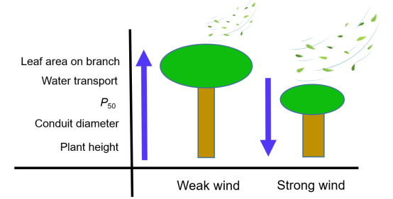 圖1. 不同風速條件下植物性狀的變化。強風降低了林冠和植物的邊界層阻力,導致植物表面變干,并受到機械損傷。在此條件下,強抗旱性、枝條上較少的葉片和強機械抗性對植物是有利的。與此相反,在低風速條件下,植物受到的干旱脅迫、機械損傷較低,植物木質部導水更快,長的更高。