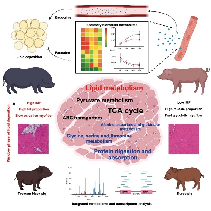 中國(guó)是世界上最大的豬肉生產(chǎn)和消費(fèi)國(guó)。桃源黑豬原產(chǎn)于湖南省桃源縣,是中國(guó)特有的脂肪型地方品種豬,與瘦肉型杜洛克豬相比,具有更高的肌內(nèi)脂肪含量和慢肌纖維占比,以優(yōu)良的肉品質(zhì)著稱,同時(shí)具有更豐富的外周脂肪沉積。調(diào)控桃源黑豬的脂肪沉積,在降低外周脂肪的同時(shí)提高肌內(nèi)脂肪含量,具有較高的經(jīng)濟(jì)價(jià)值。同時(shí),挖掘和利用我國(guó)地方豬種質(zhì)資源,對(duì)實(shí)現(xiàn)種業(yè)振興具有重要的意義。肌肉和脂肪組織同時(shí)是重要的代謝和分泌器官,肌肉和脂肪組織之間通過(guò)分泌因子進(jìn)行對(duì)話,也被稱為“肌-脂互作軸”。分泌型代謝物作為肌-脂互作的重要媒介,能夠調(diào)控肌肉分化、代謝穩(wěn)態(tài)和脂肪沉積。因此,桃源黑豬和杜洛克豬也是研究肌-脂互作機(jī)制和代謝性疾病的理想動(dòng)物模型。