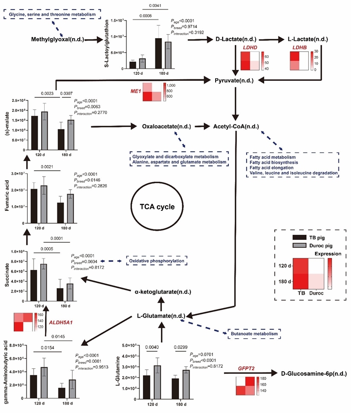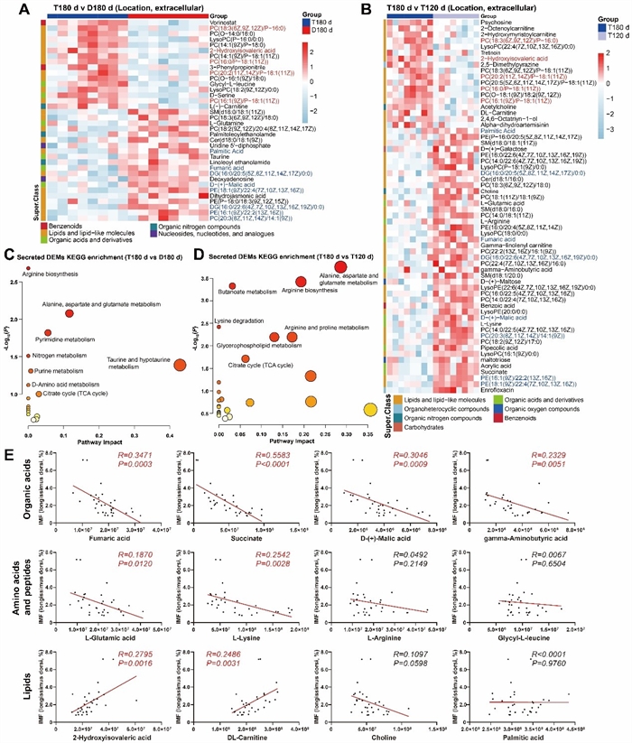 該研究通過(guò)對(duì)不同日齡桃源黑豬和杜洛克豬的背最長(zhǎng)肌組織進(jìn)行非靶向代謝組學(xué)分析,結(jié)合脂肪沉積表型數(shù)據(jù),研究人員首先確定了桃源黑豬脂肪沉積和肉品質(zhì)形成的“窗口期”為120至180日齡。代謝組與轉(zhuǎn)錄組聯(lián)合分析揭示“窗口期”日齡與品種間背最長(zhǎng)肌代謝差異主要富集在能量、脂質(zhì)和氨基酸蛋白質(zhì)代謝相關(guān)通路。隨后鑒定了數(shù)十種180日齡桃源黑豬背最長(zhǎng)肌的特異性代謝產(chǎn)物。