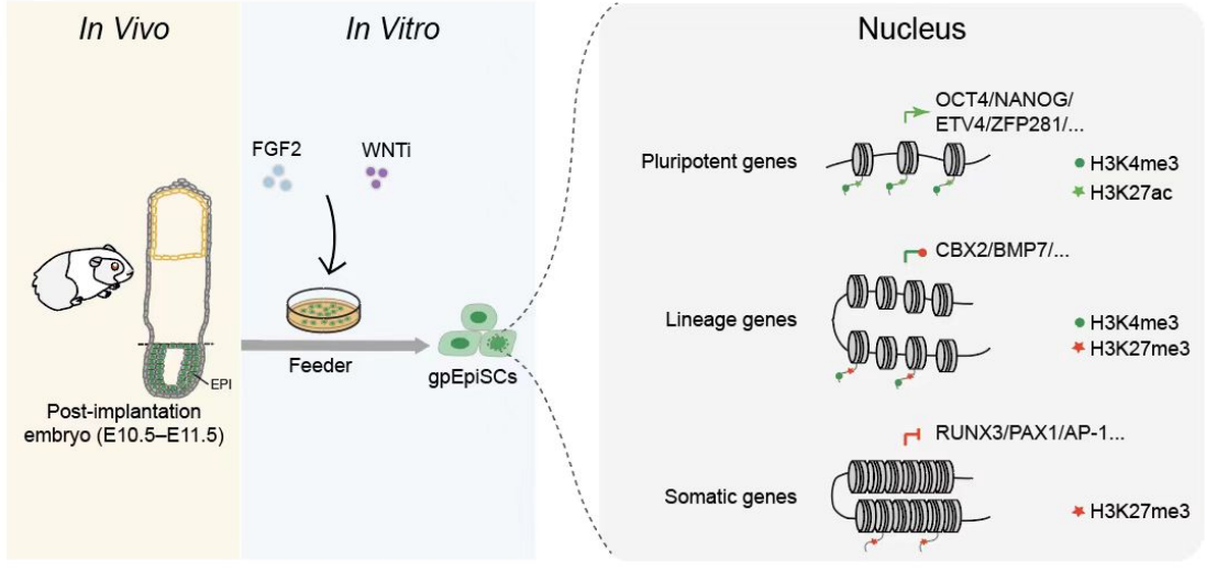 在該項研究中,研究團隊從豚鼠植入后胚胎中成功分離培養出始發態多能干細胞系gpEpiSCs。這些細胞系在優化后的培養基中能穩定傳代并維持多能性,表達OCT4、SOX2和NANOG等關鍵多能性標志物,能夠形成具有三個胚層細胞類型的畸胎瘤,核型穩定。在信號調控上,FGF2、ACTIVINA和WNT信號通路在維持gpEpiSCs多能性和抑制分化中起關鍵作用。對轉錄組和表觀遺傳組測序分析顯示,gpEpiSCs在與人類和嚙齒動物的始發態多能干細胞高度相似的同時也表現出獨特的基因表達譜,提供了新的物種特異性多能機制見解。
