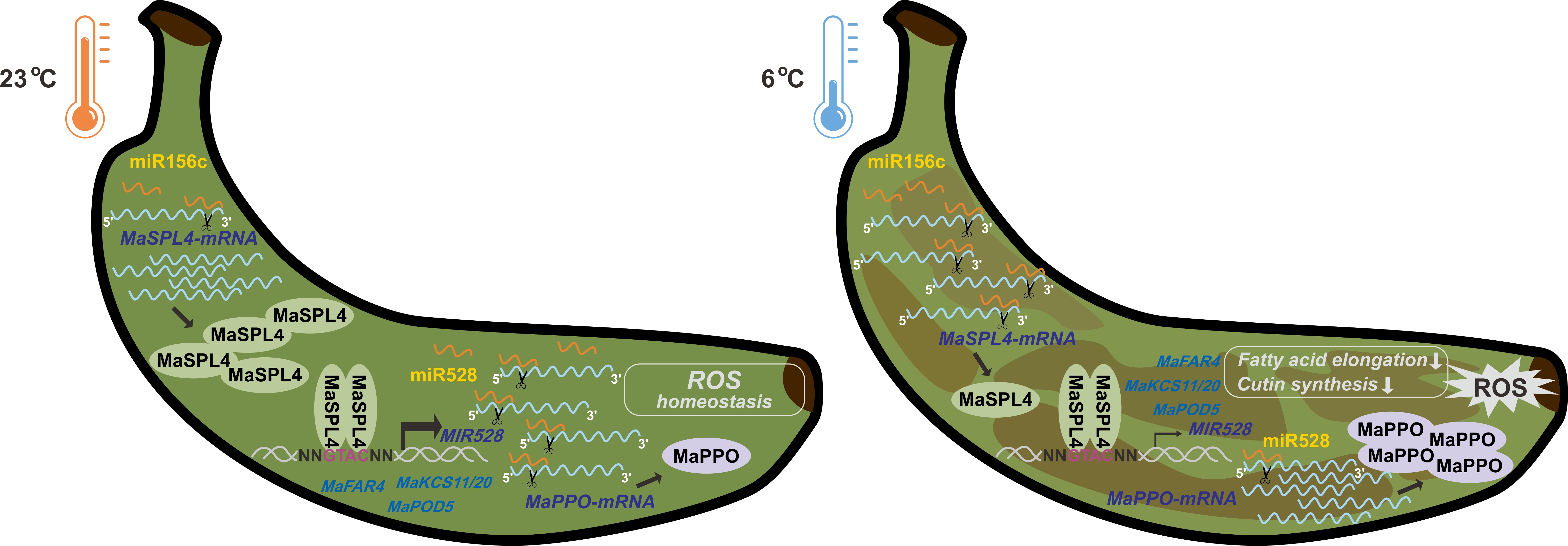 防控冷害一直是水果保鮮產業的技術難題,而解析冷害發生及調控機制是采后生物學的前沿科學問題。香蕉是世界上產量和貿易量最大的水果,作為熱帶亞熱帶作物,香蕉對低溫十分敏感,極易發生冷害。主要癥狀為果皮褐變、果肉硬化、嚴重時果實將無法正常后熟,導致失去商品價值,造成巨大的經濟損失。MicroRNA (miRNA) 是一類長度為20-24個核苷酸的非編碼單鏈小分子RNA,調控轉錄后的基因沉默,在植物生長發育和逆境響應中發揮關鍵作用。去年,兩位美國科學家因首次發現miRNA及其在轉錄后基因調控中的作用而獲得諾貝爾生理學或醫學獎。