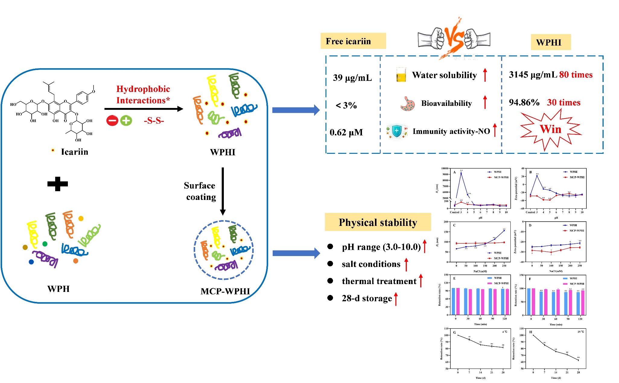 圖. 核桃蛋白水解物-淫羊藿苷納米粒子(WPHI)的復合作用及其三元納米復合物(MCP-WPHI)的穩定性分析。