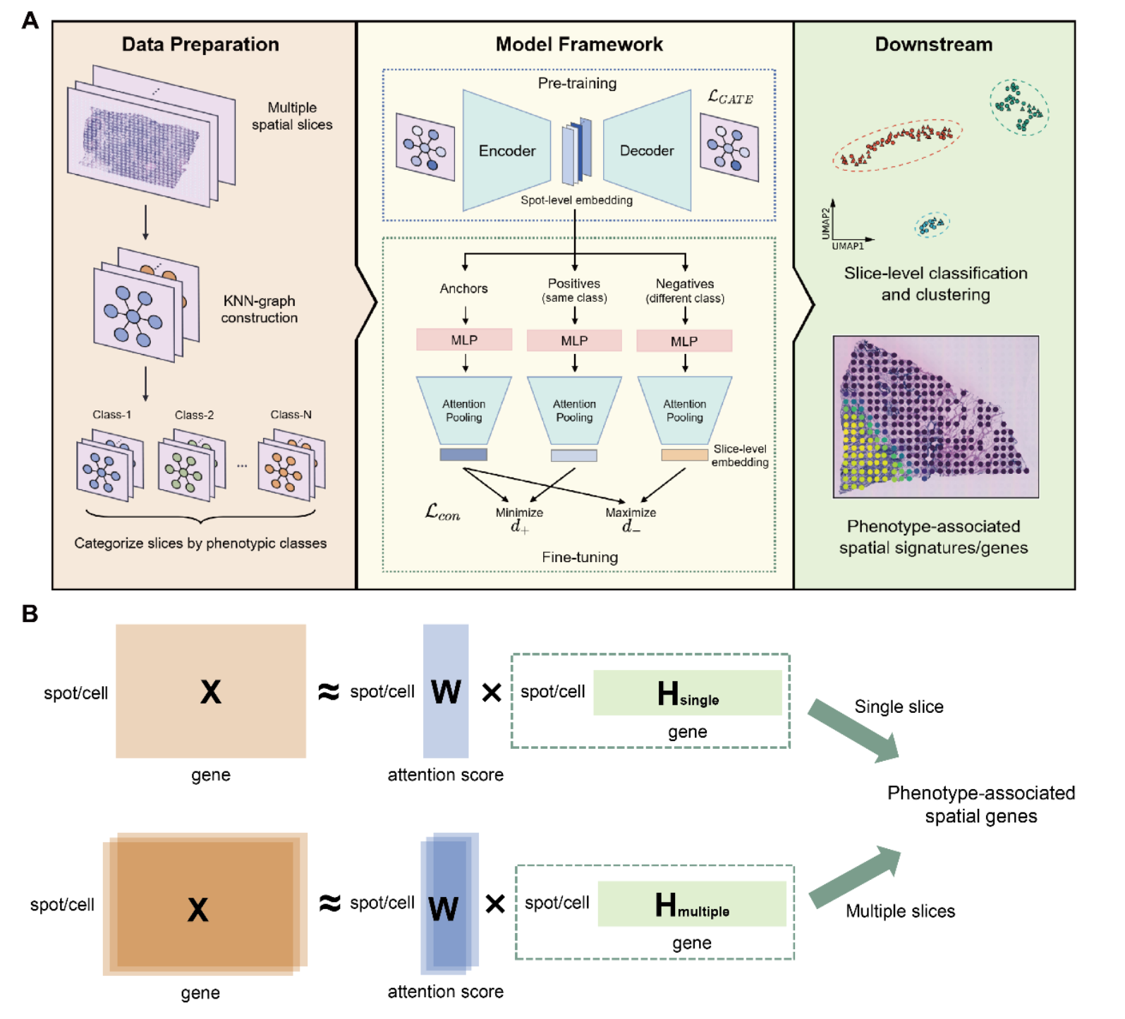 當前的一些計算方法主要關注于單個或數個切片中細胞級別特征,對大量空間轉錄組學切片數據處理的效能不足。有別于此,PASSAGE提出基于多層次注意力的大規模異構空間組學表征方法,從空間組切片(slice)、細胞與分子多個層次進行不同粒度的表征學習與解析,有效增強了計算效率和可擴展性。具體來說,PASSAGE在基于圖注意力自編碼器的細胞級表征基礎上設計了注意池化層(attention pooling layer),將同一切片的所有細胞加權融合成切片級表征,而后通過由表型信息指導的對比學習策略對切片級表征進行優化,并進而采用非負矩陣分解方法獲得基因級別的注意力分數,從而實現對特定表型關聯空間組學特征的有效解析(圖1)。