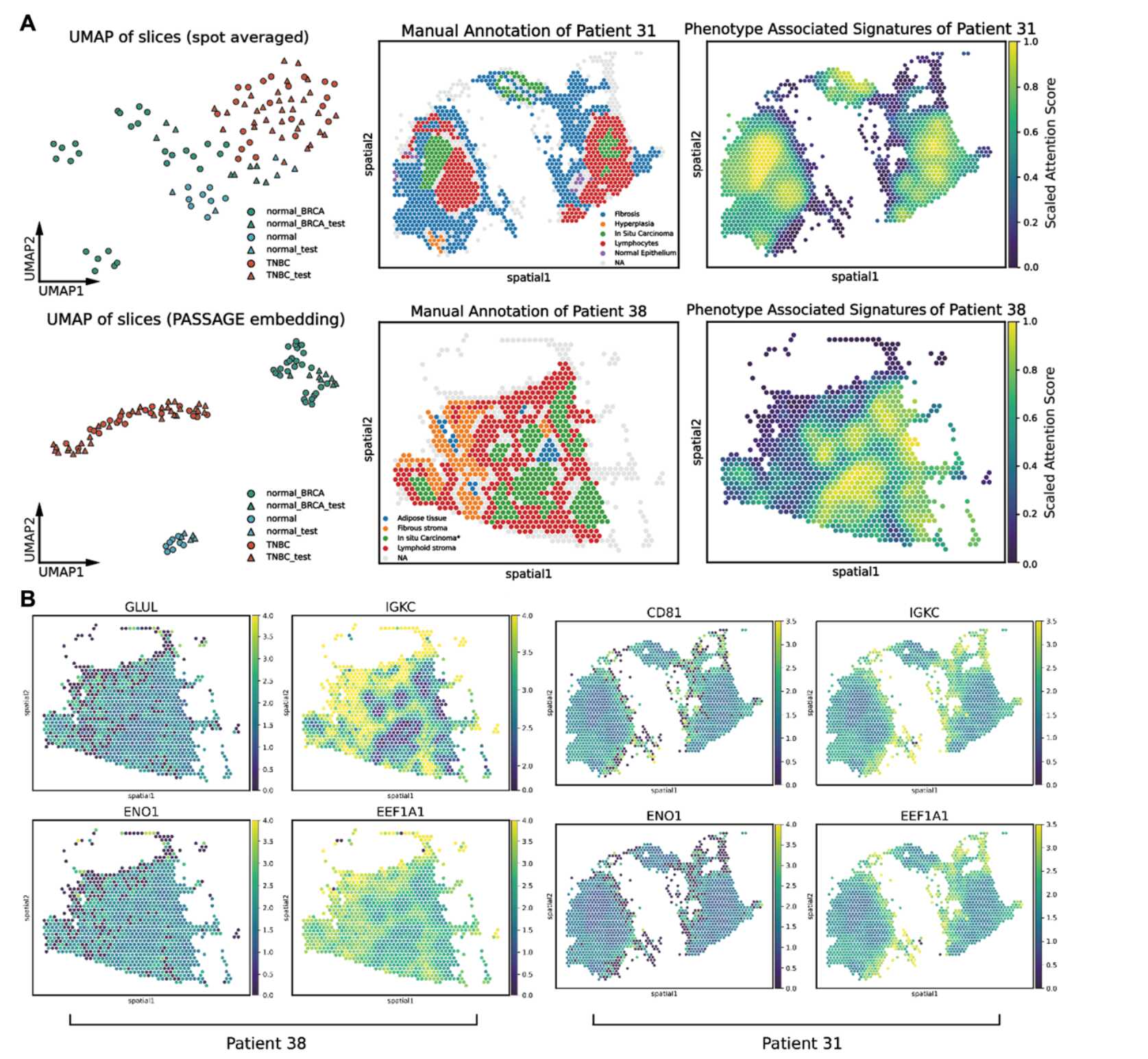 圖2 ?A)PASSAGE在乳腺癌案例中成功學習到良好的切片級表征與所識別的表型關聯空間特征?B)PASSAGE在乳腺癌案例中成功學習到與表型關聯空間特征高度關聯的基因集
