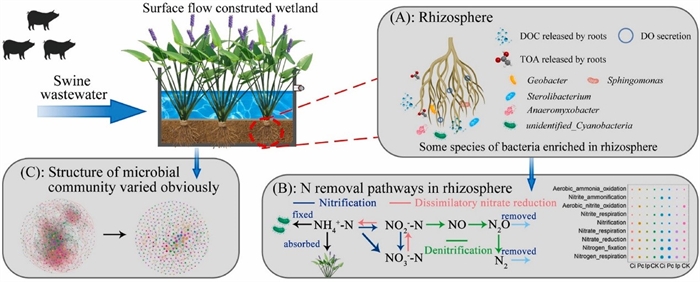 植物是人工濕地系統(tǒng)的重要組成部分之一,其根際是植物與微生物相互作用的主要區(qū)域。大約5%-21%的總光合固定碳以根系分泌物的形式轉(zhuǎn)移到根際,根系分泌物可以改變根際微生物的豐度和多樣性,進而影響人工濕地中氮的去除效率。然而,處理高負(fù)荷污水過程中植物根系分泌物的變化特征及根際微生物群落的響應(yīng)機制仍不清楚。因此,中國科學(xué)院亞熱帶農(nóng)業(yè)生態(tài)研究所吳金水研究員團隊通過野外小區(qū)控制試驗,選擇了美人蕉、梭魚草和黃菖蒲三種濕地植物對養(yǎng)殖廢水進行處理。研究旨在揭示處理高負(fù)荷污水過程中濕地植物根際微生物群落的響應(yīng)特征及氮去除機制。