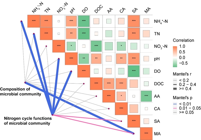 研究發(fā)現(xiàn):相比于美人蕉,梭魚草和黃菖蒲更適合處理含高濃度氮的養(yǎng)殖廢水。梭魚草和黃菖蒲根系分泌的溶解性有機碳(DOC)和總有機酸(TOA)在處理養(yǎng)殖廢水后分泌速率增加,而美人蕉則呈現(xiàn)相反趨勢。不同濕地植物根際微生物群落具有相同的優(yōu)勢門,但其相對豐度上存在差異。在處理養(yǎng)殖廢水后微生物群落具有更加明顯的協(xié)同和共生關(guān)系。養(yǎng)殖廢水中的NH4+-N、TN濃度、pH、溶解氧(DO)含量以及根系分泌的丙二酸和琥珀酸可促進根際低豐度的氮循環(huán)功能微生物生長,進而增強微生物對氮素的降解能力,從而提高了人工濕地中氮的去除效率。本研究結(jié)果有助于進一步理解高負(fù)荷污水處理過程中植物根際氮的去除機理,也對人工濕地系統(tǒng)處理高負(fù)荷污水的功能提升技術(shù)具有重要理論價值。