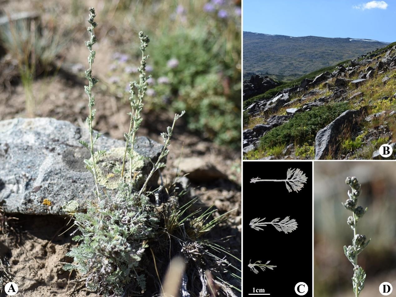 圖1. 新球序絹蒿(Artemisia neolehmanniana G.Z. Jin)。A:野外植株,B:生境,C:葉片(從上到下:下部葉,中部葉,上部葉),D:復合花序。