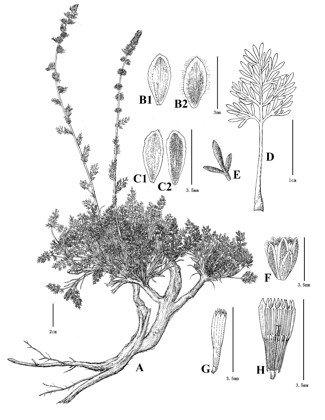 圖2. 新球序絹蒿(Artemisia neolehmanniana G.Z. Jin)的墨線圖(劉運笑繪畫)。A:植株,B1:外苞片(內側),B2:外苞片(外側),C1:中苞片(內側),C2:中苞片(外側),D:下部葉,E:葉毛被,F:頭狀花序,G:兩性花,F:兩性花(縱切)。