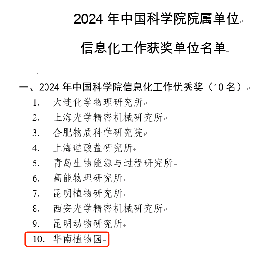 為推動院屬單位的信息化建設和應用工作,提升全院信息化水平,中國科學院組織開展了2024年全院信息化評估工作。此次評估,中國科學院華南植物園被評為A類研究所,榮獲2024年中國科學院院屬單位信息化工作優秀單位(排名第10)。